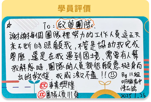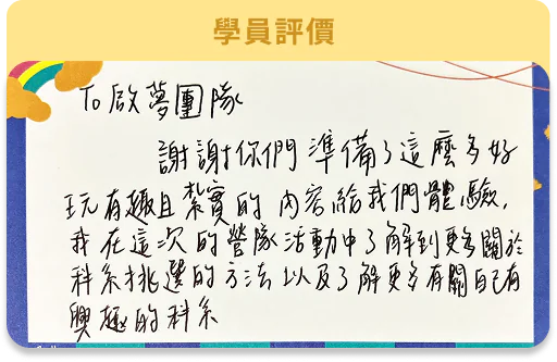 ★營隊結束後,將獲得一份完整學習歷程,以及學生探索狀況記錄。