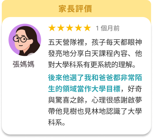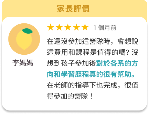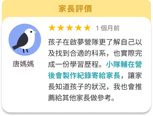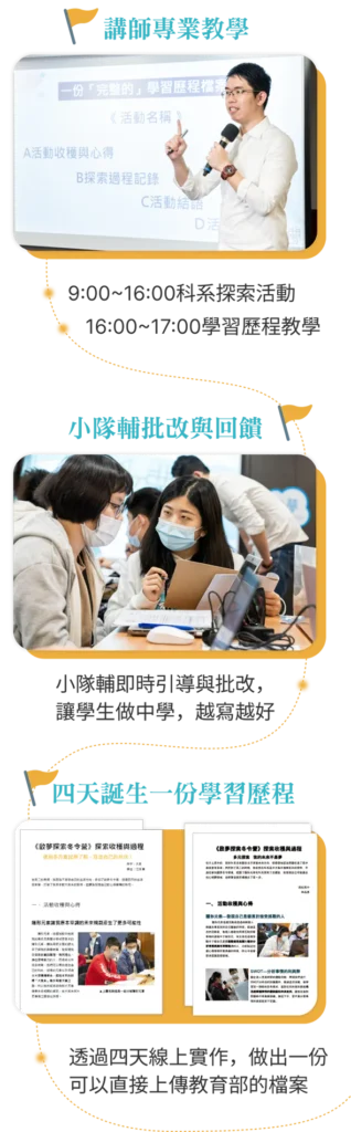 之前有學生反應找到目標科系後,讀書感覺差很多,以前只是為了讀書考試而讀,現在是為了自己的夢想讀書,變得更有動力! 另外,營隊會帶孩子做出第一份歷程檔案,孩子就可以延續這個方法做出更多份學習歷程。