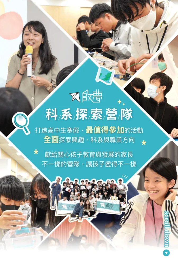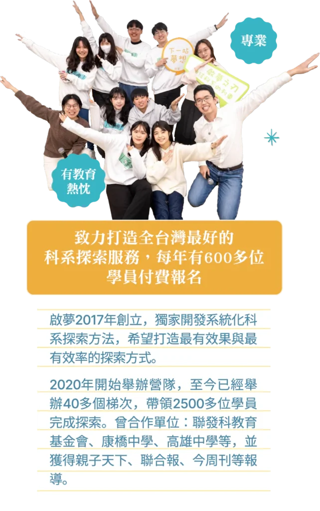 開發的內容包含:地毯式介紹科系、科系體驗活動、閱讀入門書等。啟夢已創辦5年,幫助1600多位學生找到方向,並且獲得教育創新100等獎項肯定,請家長放心讓孩子參加啟夢營隊。