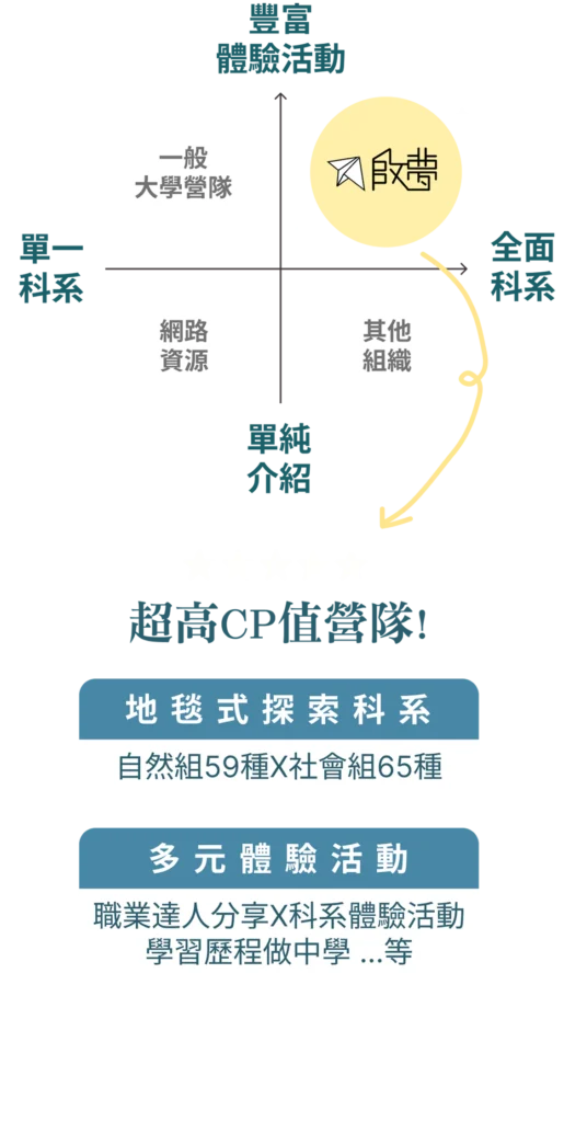 推薦「升高一」的暑假參加,CP值最高。參加完營隊後,孩子找到目標科系,就可以解決不知道怎麼選班群、選類組的問題。