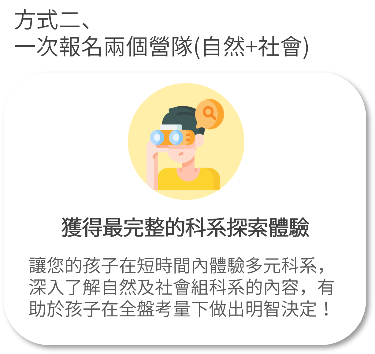 ▼若看完後,孩子仍然對選擇自然/社會組感到困惑,或對自然/社會組涵蓋的學群皆產生興趣,那可以考慮以下兩種啟夢營隊的報名方式來解決困境!